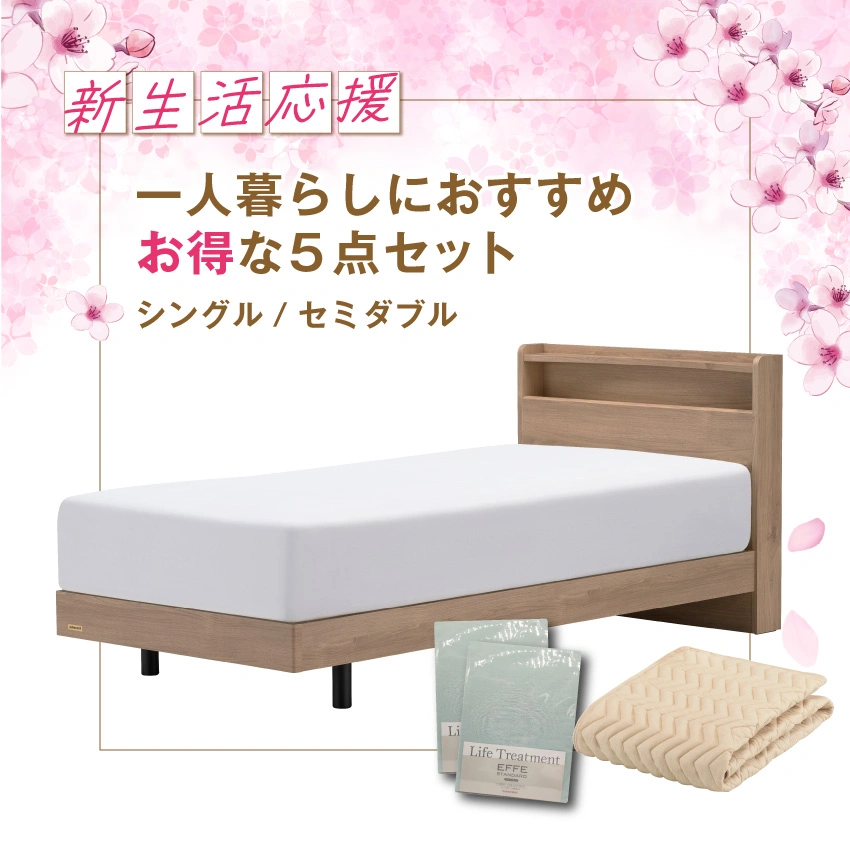 こちらの2人で始める【新生活応援セット5】は、フランスベッドの人気の高級感あるベッドフレームのダブルサイズが、マットレス、寝装品とセットになって登場。新生活応援クーポン対象商品です。くわしくはこちら。