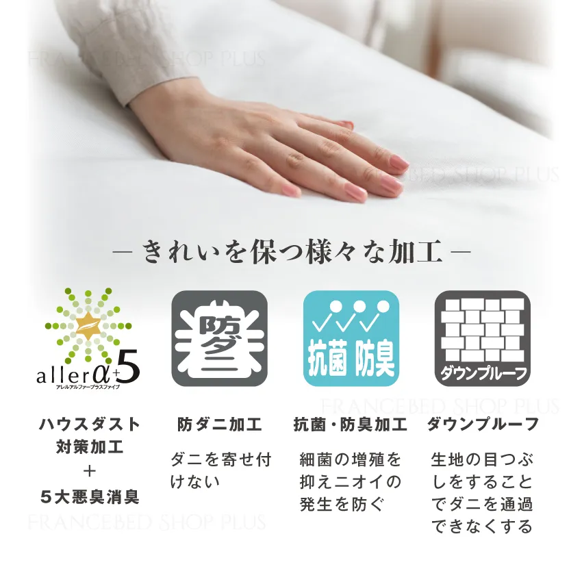 「アレルα加工」は、ハウスダストの中に含まれるダニのフンや死がい、花粉などのアレルギー原因物質をキャッチして無害化する働きがあります。体にやさしく、長期間にわたり効果を維持し、安全にアレルゲンを抑えることで、毎日の眠りをより清潔で快適に保ちます。