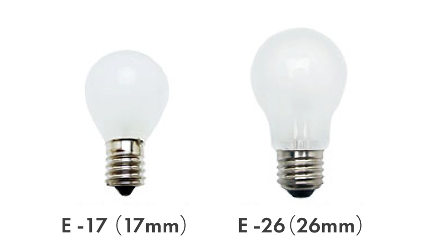 電球は口金のサイズ(E-26、E-17など)がございます。照明器具によって電球の口金のサイズが異なりますので、電球交換の際には必ず口金のサイズをご確認ください。一般的な口金のサイズはE-26とE-17ですが、小さめのE-12などもございます。