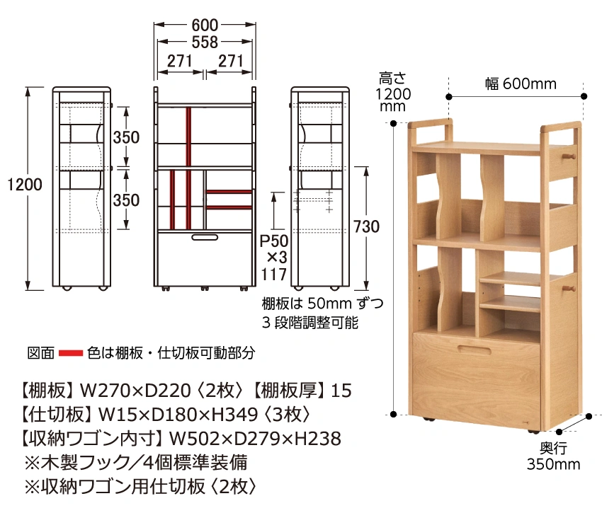 サイズ 幅600×奥行350×高さ1200mm 棚板 幅270×奥行220×厚さ15mm×2枚 仕切板 幅15×奥行180×高さ349mm×3枚 収納ワゴン内寸 幅502×奥行279×高さ238mm 備考 木製フック/4個標準装備