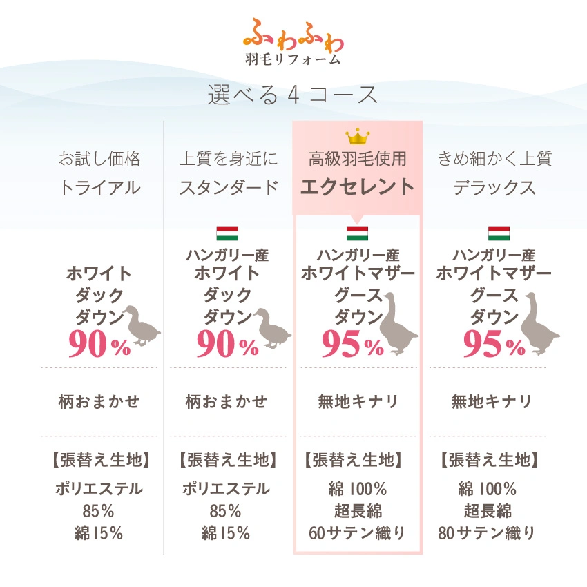 高級羽毛を使ってふわふわの仕上がりエクセレントコース