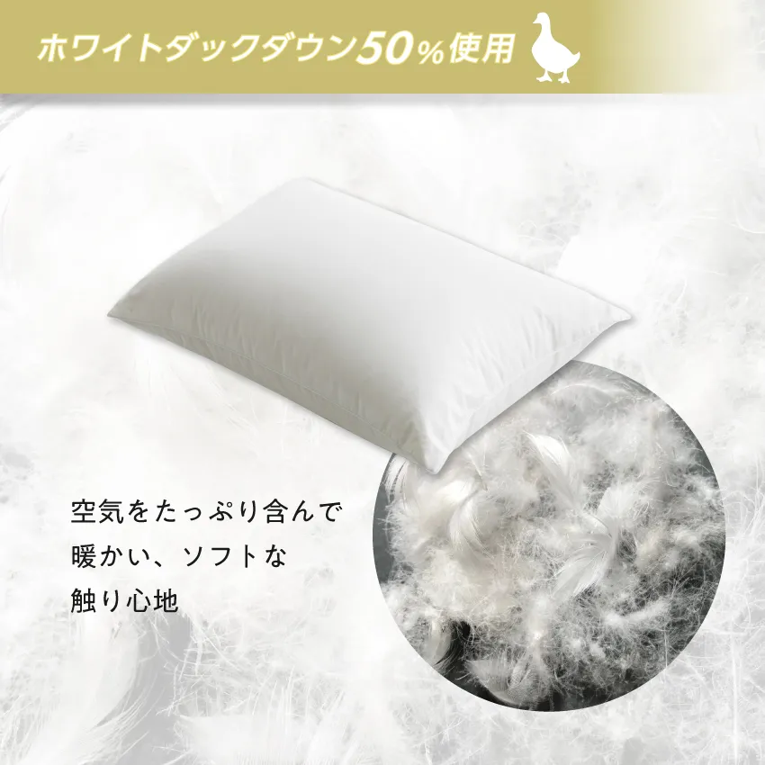 ふんわり軽いホワイトダックダウンを50%使用。ほどよく弾力があり、しなやかで柔らかい触り心地です。枕の場合、ダウン使用率が高くなると柔らかすぎて頭を支えられないですが、ダウンのやわらかさはそのままに、しっかりと首や頭も安定させる程よい硬さも兼ね備えています。