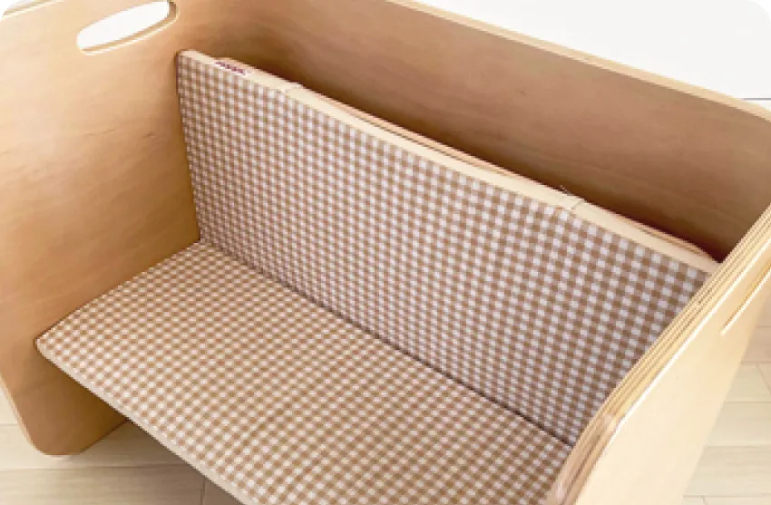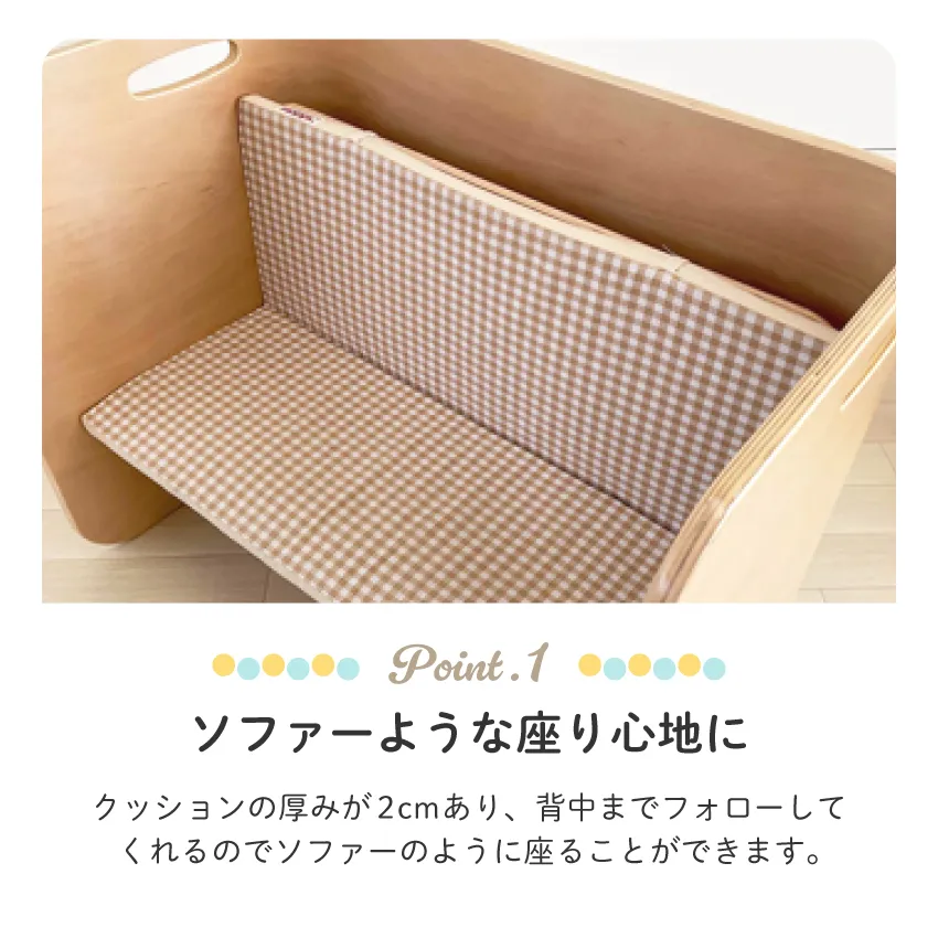 可愛いチェック柄とシンプルなホワイトのデザイン。クッションがあることで楽に読書やおままごとが楽しめます。