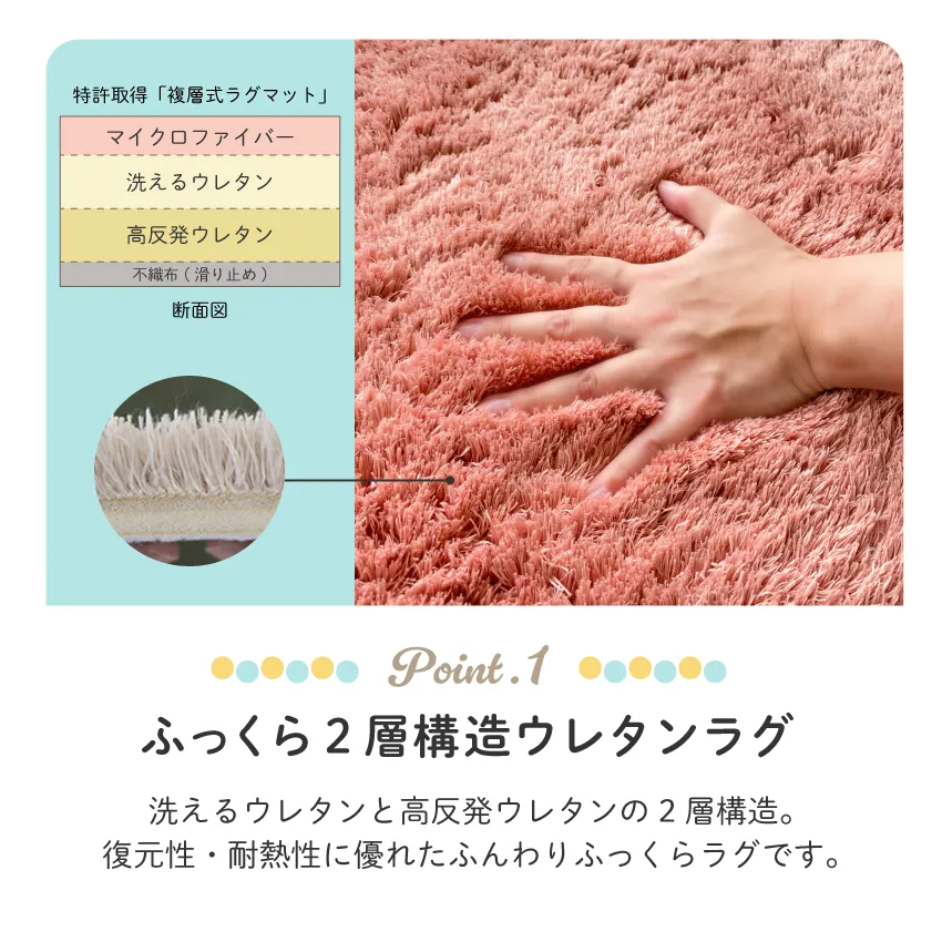 洗えるウレタンと高反発ウレタンの2層構造。異なるウレタンを使用することにより、復元性・耐久性に優れたふんわりラグに。表面にはふんわり極細のマイクロファイバーを使用しています。