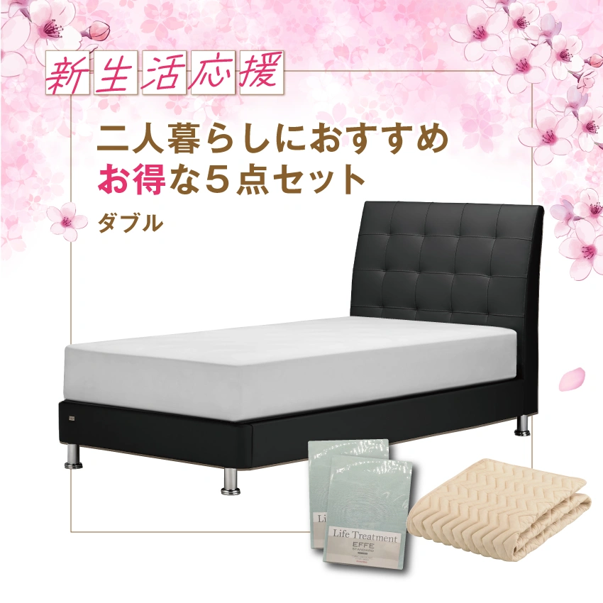 【新生活応援】2人暮らし応援 新生活ペアスタートセット ダブル 高級感あるベッドフレーム お得な5点セット 軽量でラクラクベッドメーキング「ZI-100」 マットレスカバー ブルー ベッドパッド 高密度連続スプリング