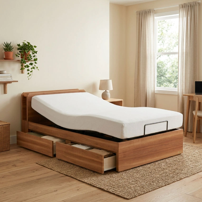 薄型電動ユニット採用で引き出し付き電動リクライニングベッドが可能に!