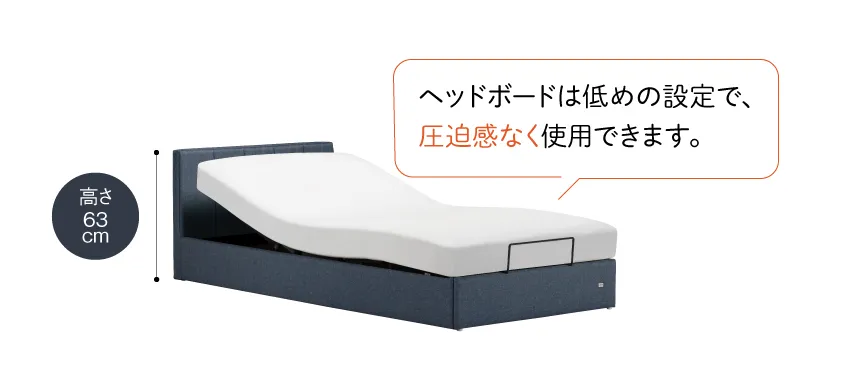 IQベッドシリーズから親しみやすいファブリックベッドフレーム「リンカーン」に薄型電動ユニットがついて登場!標準タイプのヘッドボードの高さが、80cm前後のものに比べて、リンカーンは「63cm」と低めの設定なので、お部屋に圧迫感を与えにくいベッドフレームとなっています。