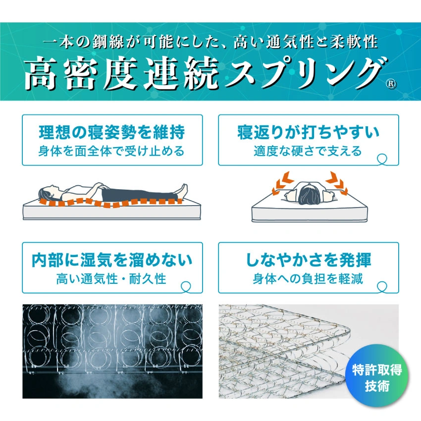 日本人の体型、体格、高温多湿な日本の気候など、様々な研究を重ねて作り出した高密度連続スプリング®は、通気性、耐久性に優れ、柔らかすぎない適度な硬さで理想の寝姿勢を実現することで、より快適な眠りをご提供します。