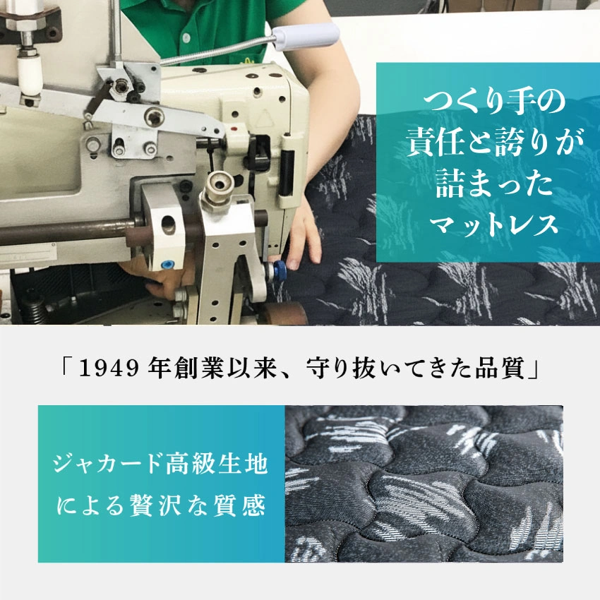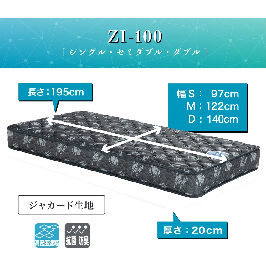 サイズ 幅122×長さ195×厚さ20cm 重量 20kg スプリング 高密度連続スプリング® 生地 ジャカード生地 機能 抗菌加工 備考 - 両面仕様