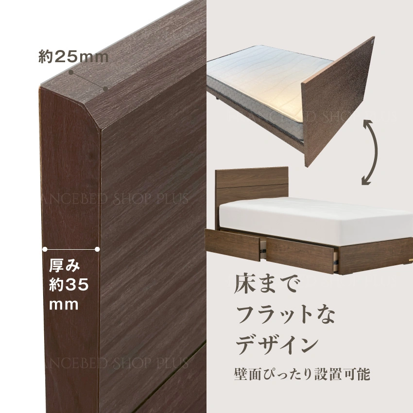 ヘッドボードに溝が入っているのがアクセントになっています。床までフラットなヘッドボードだから、壁面にぴったり付けて設置することができます。