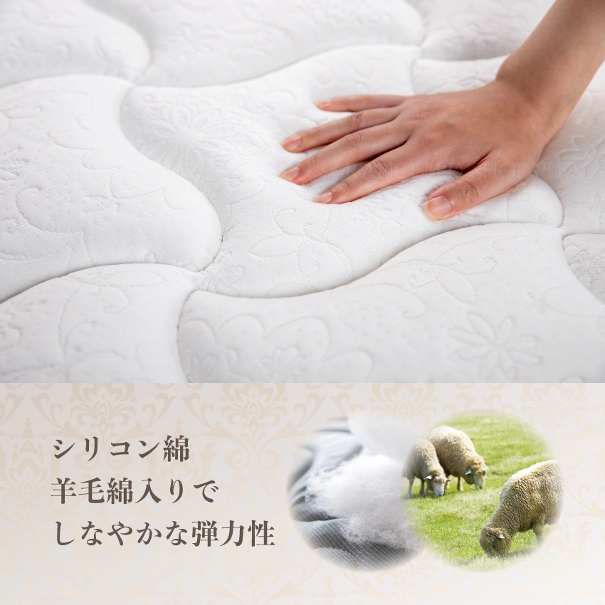 しなやかな弾性を持つシリコン綿が、しっかりと体を支えてくれるので、気持ちよく眠ることができます。また羊毛綿は、保温性・弾力性・吸湿性・放湿性に優れています。冬は暖かく、夏は涼しく使うことができます。マットレスの寝心地をより快適にするだけではなく、気になる寝汗や睡眠時の蒸れ対策にもおすすめの素材です。