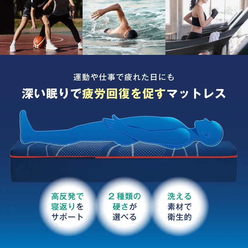 疲労回復につながり、汗をかいても取り出して洗える素材を採用しています。ジム通いや、運動を頑張るアクティブな方におすすめしたいマットレスです。