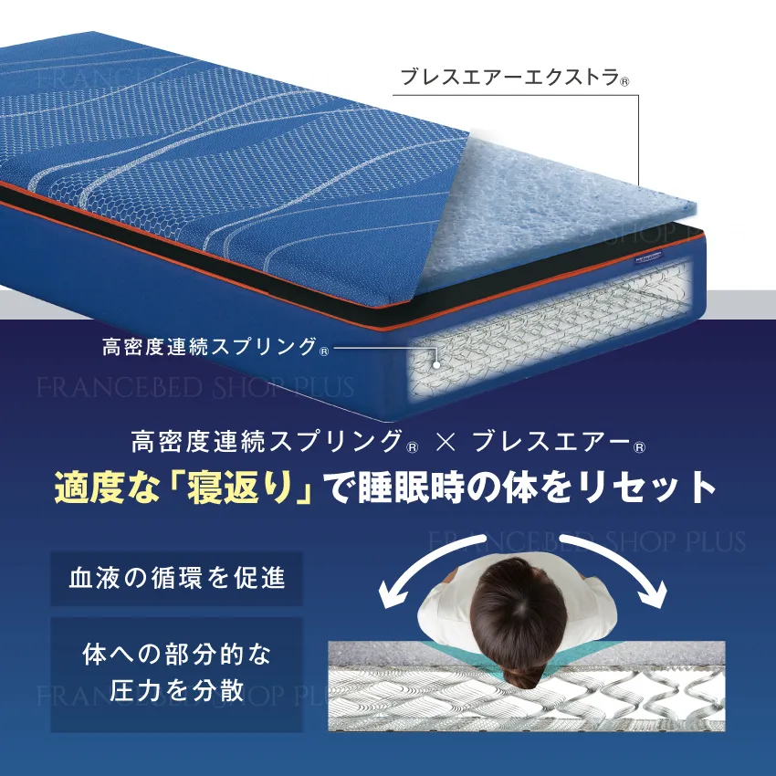睡眠中、適度に寝返りをうつと血流が良くなり、身体にかかる負担が軽減されて睡眠の質が高まります。本製品は、「ブレスエアーエクストラ®」 と呼ばれる高い弾力性・通気性をもつ特殊素材を使用し、高密度連続スプリング®と合わせることで、しっかりと寝返りをサポート。硬めの寝心地になります。