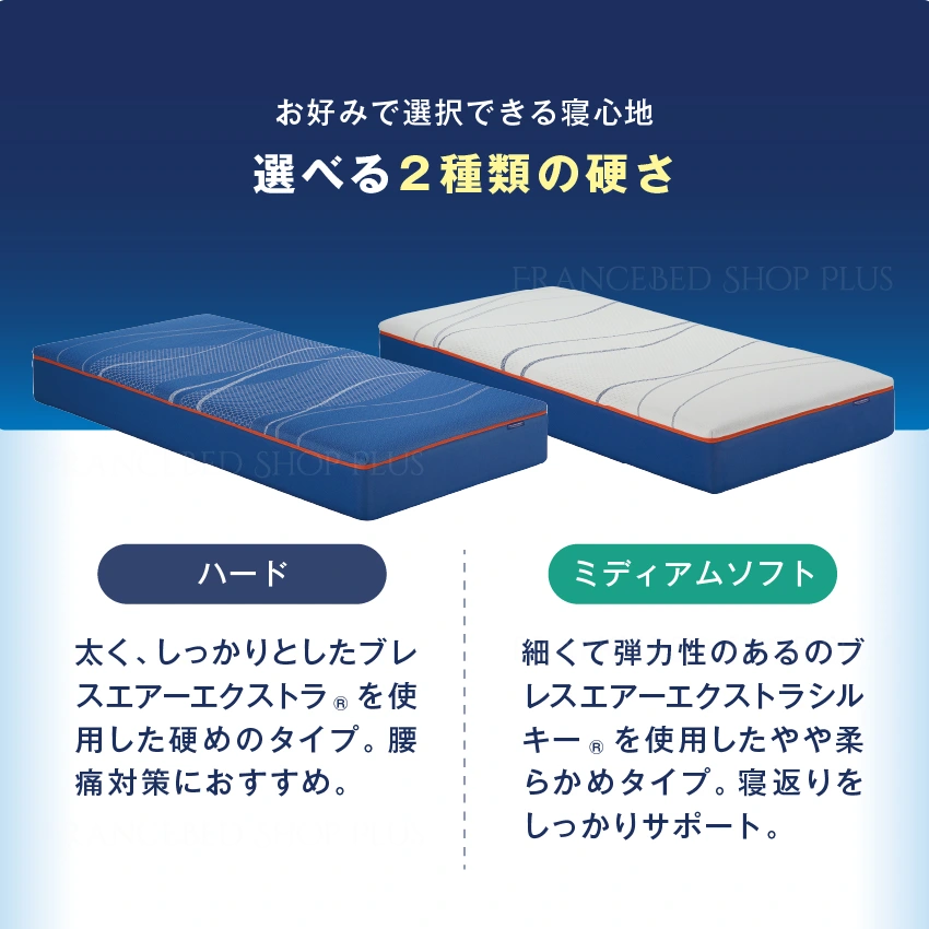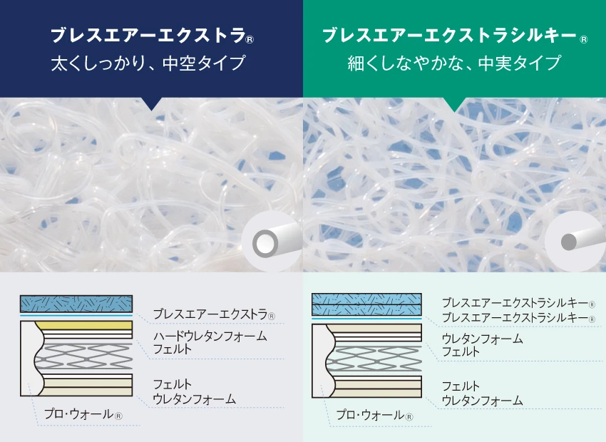 ブレスエアーエクストラ®とブレスエアーエクストラシルキー®の比較 ハードとミディアムでブレスエアー®の太さやつくりを変えることで、硬さの違いを出しています。また、ハードには硬めのハードウレタンを使用し、しっかりと硬い寝心地に仕上げています。