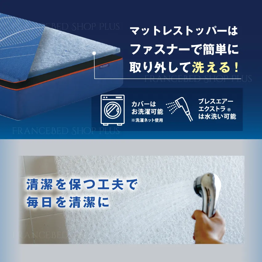 マットレストッパー(ブレスエアー®)は、ファスナーから取り出し、シャワーなどで水洗いが可能です。また、取り出したマットレストッパーのカバーもお洗濯ができます。 汗をかいた日にも、毎日清潔な寝心地を保ちます。