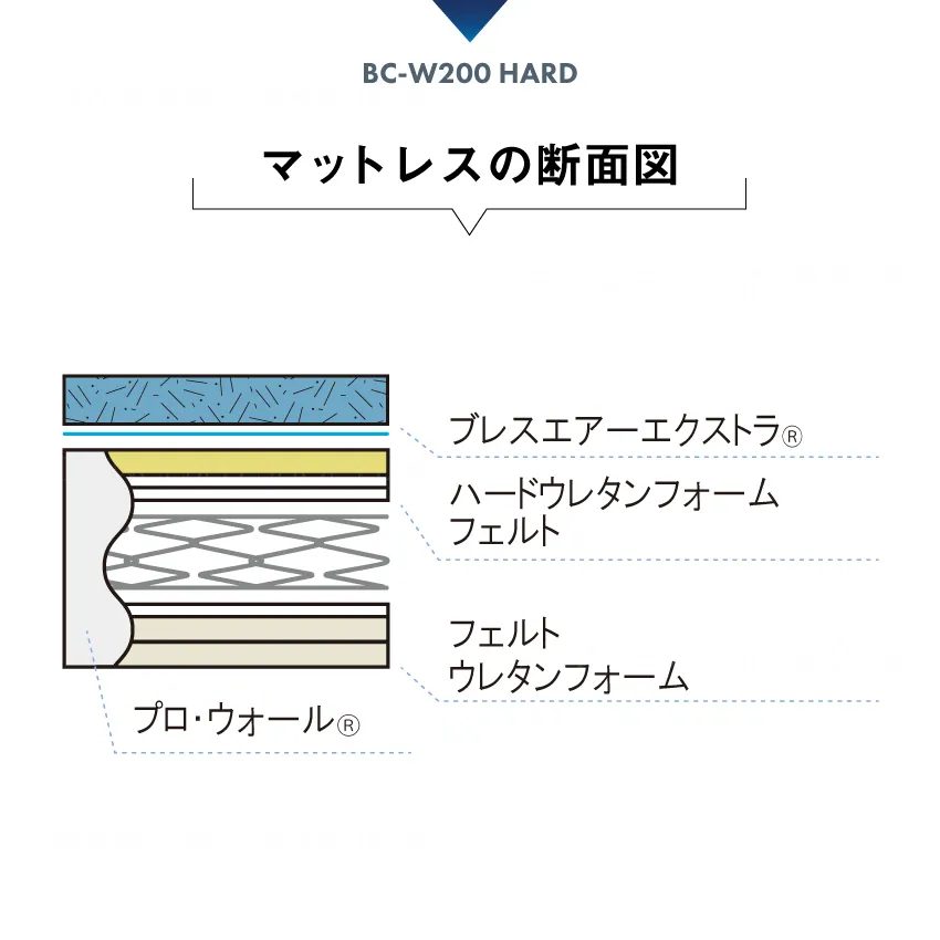 サイズ 幅140×長さ195×厚さ25cm 重量 34kg スプリング 高密度連続スプリング® 詰物 ブレスエアーエクストラ® 生地 ダブルニット生地 仕様 - プロ・ウォール®仕様