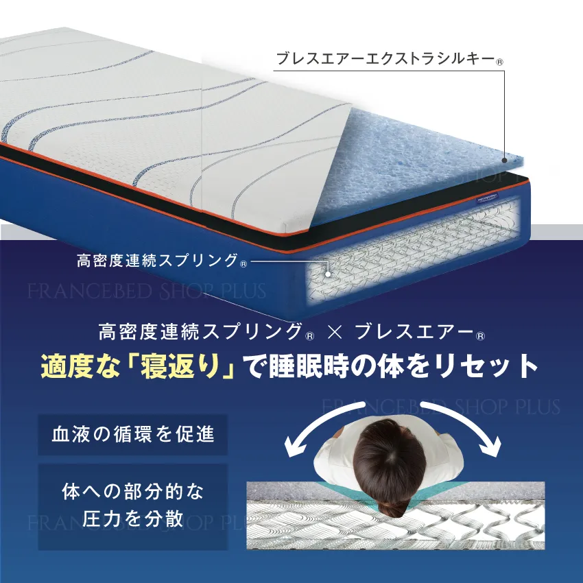 高密度連続スプリングが背骨の自然なカーブを保ち、正しい寝姿勢をサポート。身体を面でしっかりと支え、背骨のラインを保ちます。また、ブレスエアーの理想的な弾性が、身体に負担をかけず、寝返りをスムーズにサポートします。