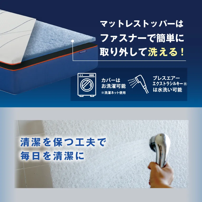 マットレストッパー(ブレスエアー®)は、ファスナーから取り出し、シャワーなどで水洗いが可能です。また、取り出したマットレストッパーのカバーもお洗濯ができます。 汗をかいた日にも、毎日清潔な寝心地を保ちます。