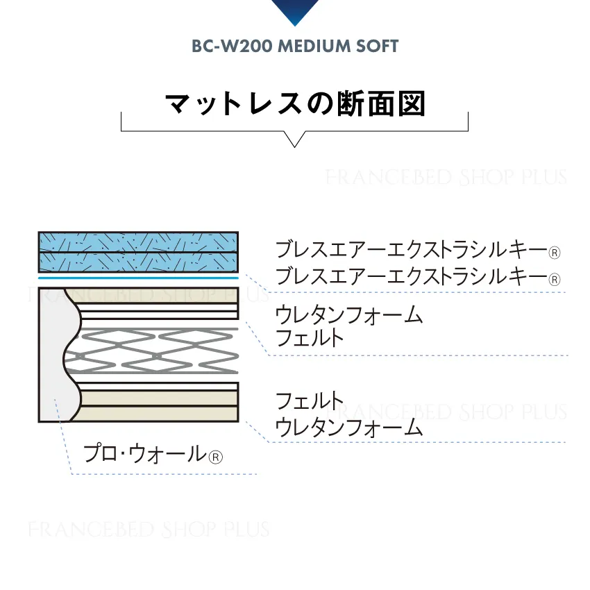 サイズ 幅97×長さ195×厚さ26cm 重量 23kg スプリング 高密度連続スプリング® 詰物 ブレスエアーエクストラシルキー® 生地 ダブルニット生地 仕様 - プロ・ウォール®仕様