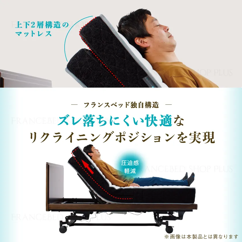 背上げを行う際、腹部が圧迫される感覚があります。上下2層構造のマットレスがスライドして動くことで、腹部への圧迫を軽減し、ストレスのないリクライニングが可能になりました。