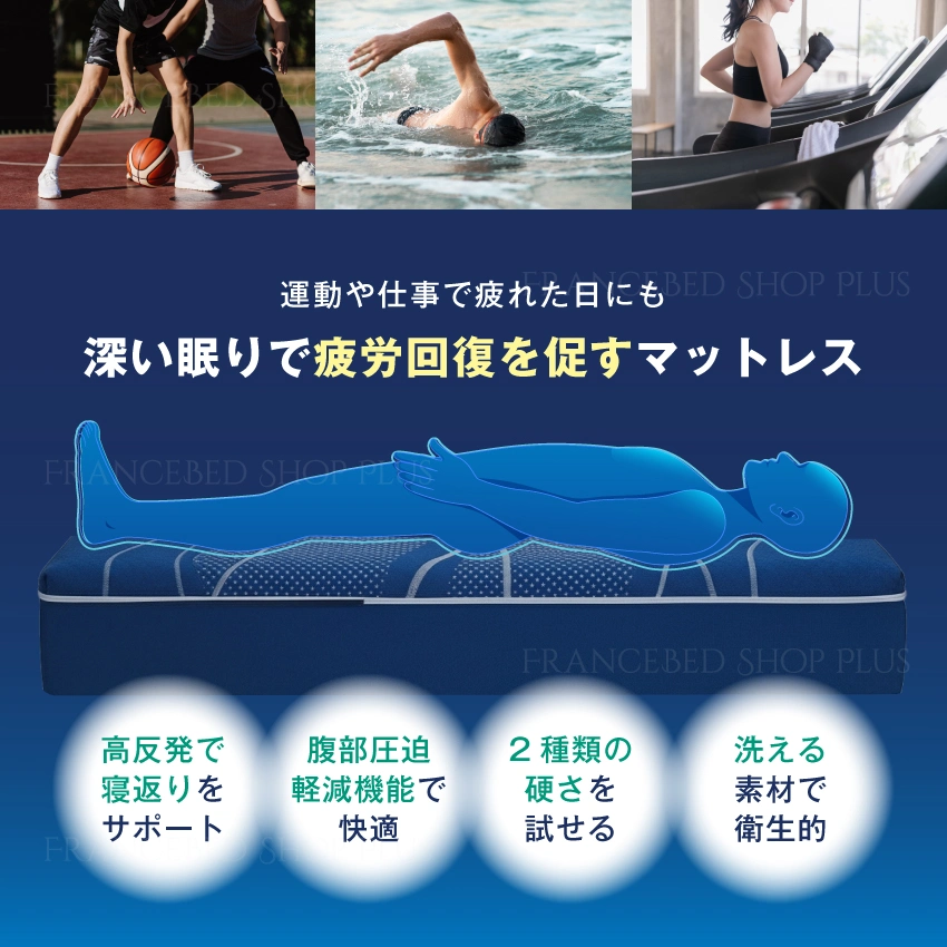フランスベッドより、スポーツをする人のための快眠設計マットレスが登場。硬めの高反発×ブレスエアー®でリカバリー力UP。寝返りがしやすく、腰痛の軽減にも役立ちます。