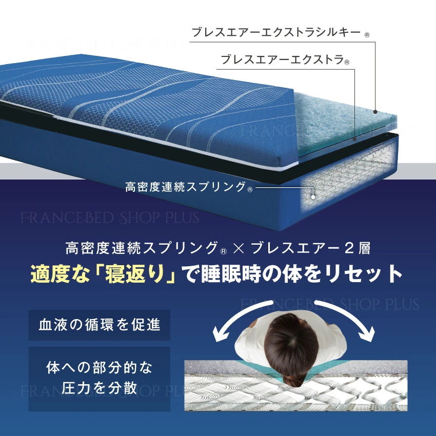 睡眠中、適度に寝返りをうつと血流が良くなり、身体にかかる負担が軽減されて睡眠の質が高まります。本製品は、「ブレスエアーエクストラ®」「ブレスエアーエクストラシルキー®」 と呼ばれる2層の高い弾力性・通気性をもつ特殊素材を使用し、高密度連続スプリング®と合わせることで、しっかりと寝返りをサポート。