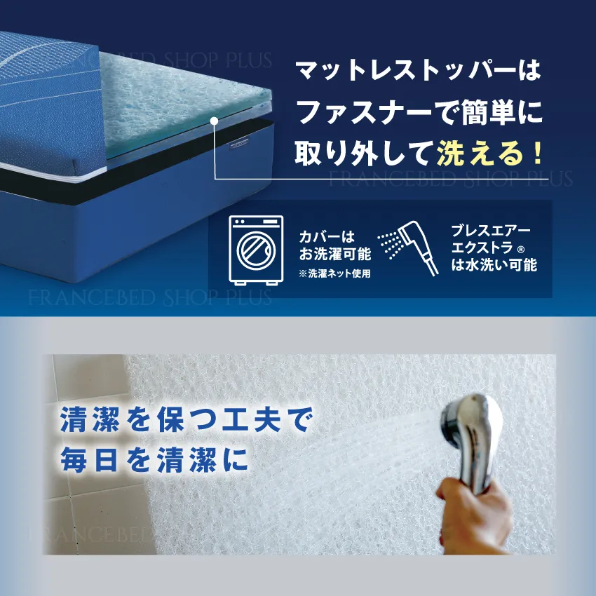 マットレストッパー(ブレスエアー®)は、ファスナーから取り出し、シャワーなどで水洗いが可能です。また、取り出したマットレストッパーのカバーもお洗濯ができます。 汗をかいた日にも、毎日清潔な寝心地を保ちます。