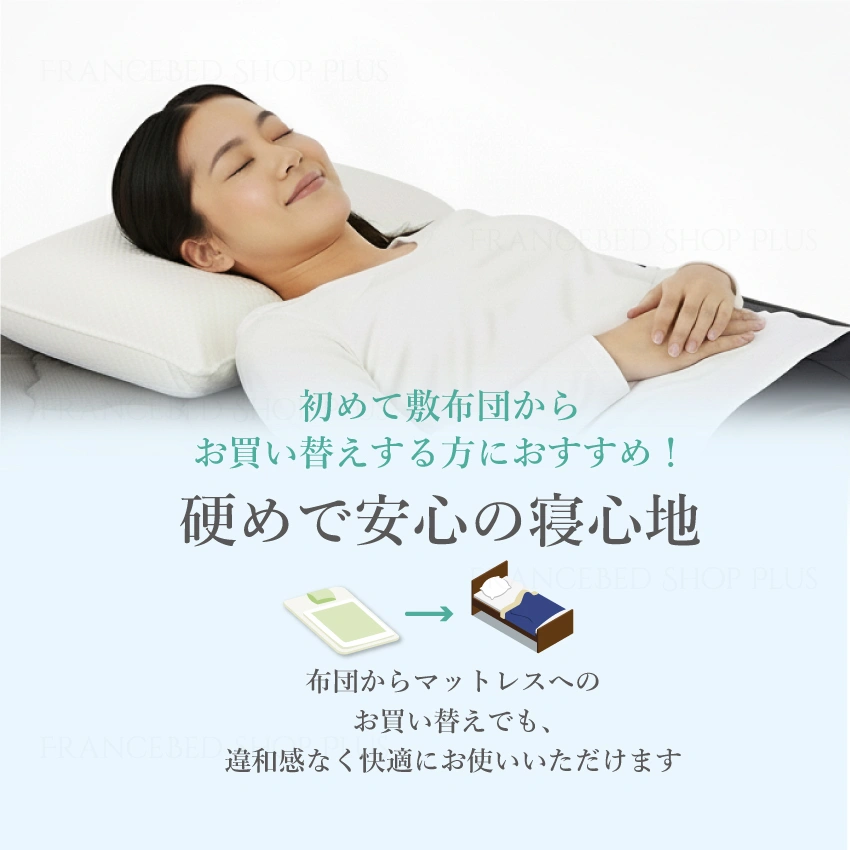 敷ふとんの硬さに慣れている方でも違和感なくお使いいただける寝心地で、特に初めてマットレスをご使用になる方や、しっかりとした硬さをお求めの方にご好評いただいています。 フランスベッドの中でも特に硬めの仕様で、快適な睡眠をしっかりとサポートします。