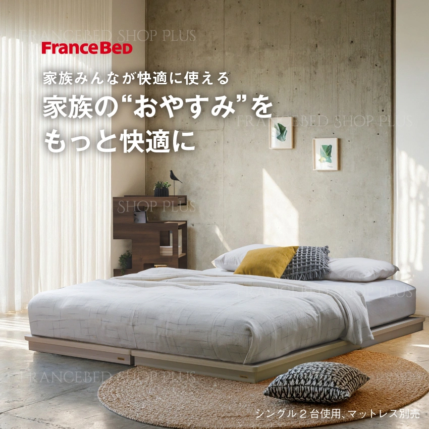 2台を並べて使用する際に中央に隙間ができないよう設計されています。2台をぴったりと密着させて設置できるため、ベッドの間に物が落ちたり、子どもが足を挟む心配もありません。小さなお子さまとの添い寝や家族みんなでの快適な眠りを叶える、ファミリーに最適なベッドフレームです。