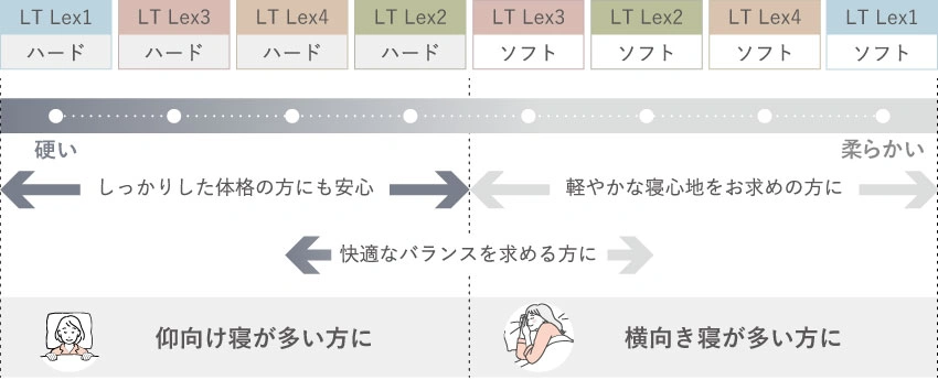 LT Lexシリーズは全グレードでハード/ミディアム2種類の硬さをご用意しています。体重の重い方、仰向き寝が多い方はハード。体重の軽い方、横向き寝が多い方はソフトがおすすめです。