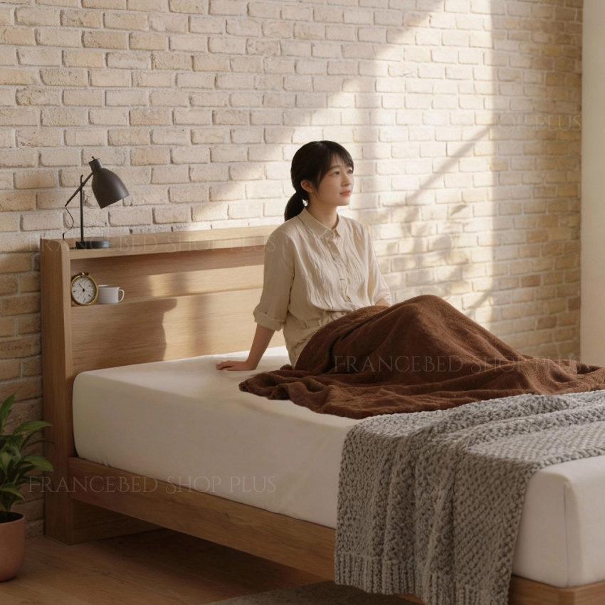 上品なグレージュが寝室にやさしく溶け込む、フランスベッドのキャビネット付きベッド。どんな壁色・床色にも合わせやすいニュートラルカラーなので、北欧・ナチュラルインテリアにも相性抜群です。