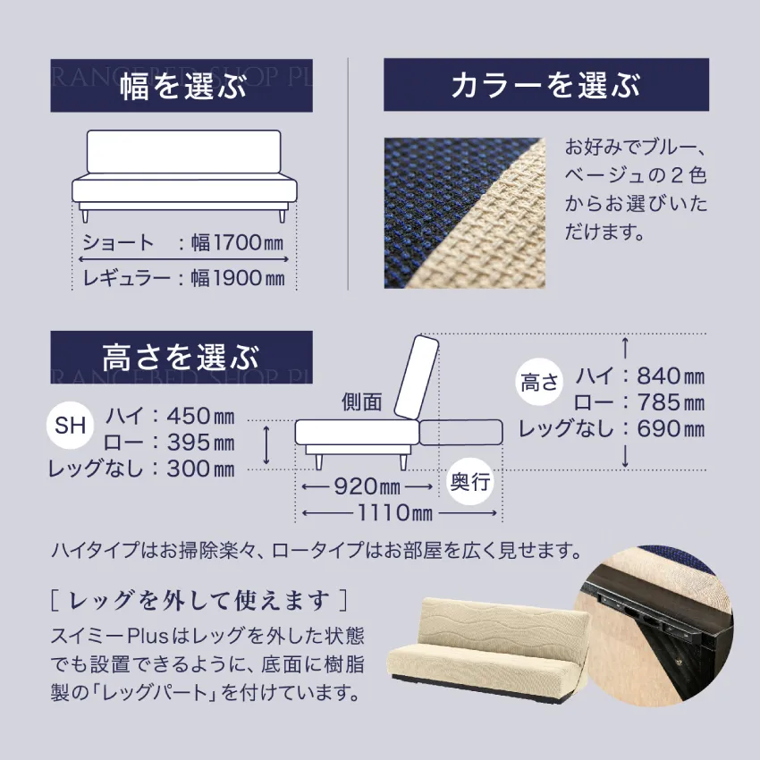 サイズ 幅1900×奥行920~1100×高さ840mm 座面の高さ 430mm 本体重量 46kg 張材 ファブリック - ポリエステル79%
