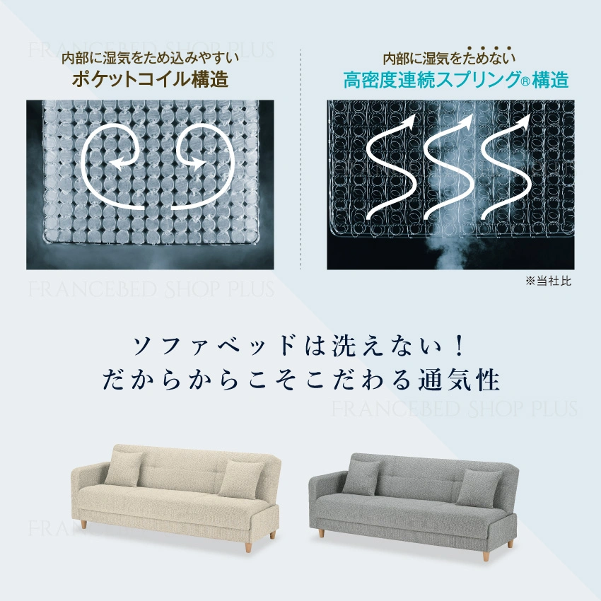 布などでコイルを包むポケットコイル構造に比べて、入眠時にかく大量の汗、起床時の湿気をため込みにくい構造なので、いつまでも爽やかな寝心地を実現します。また、鋼線の劣化を防ぎ、スプリングの寿命を守ります。