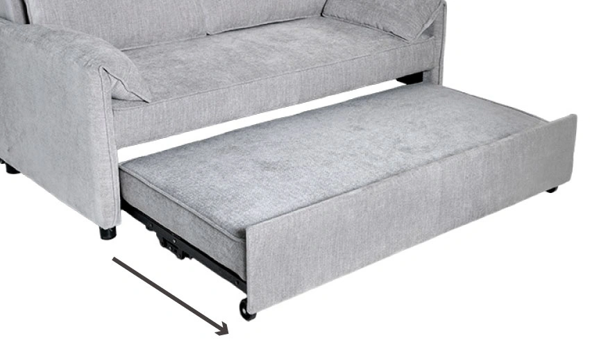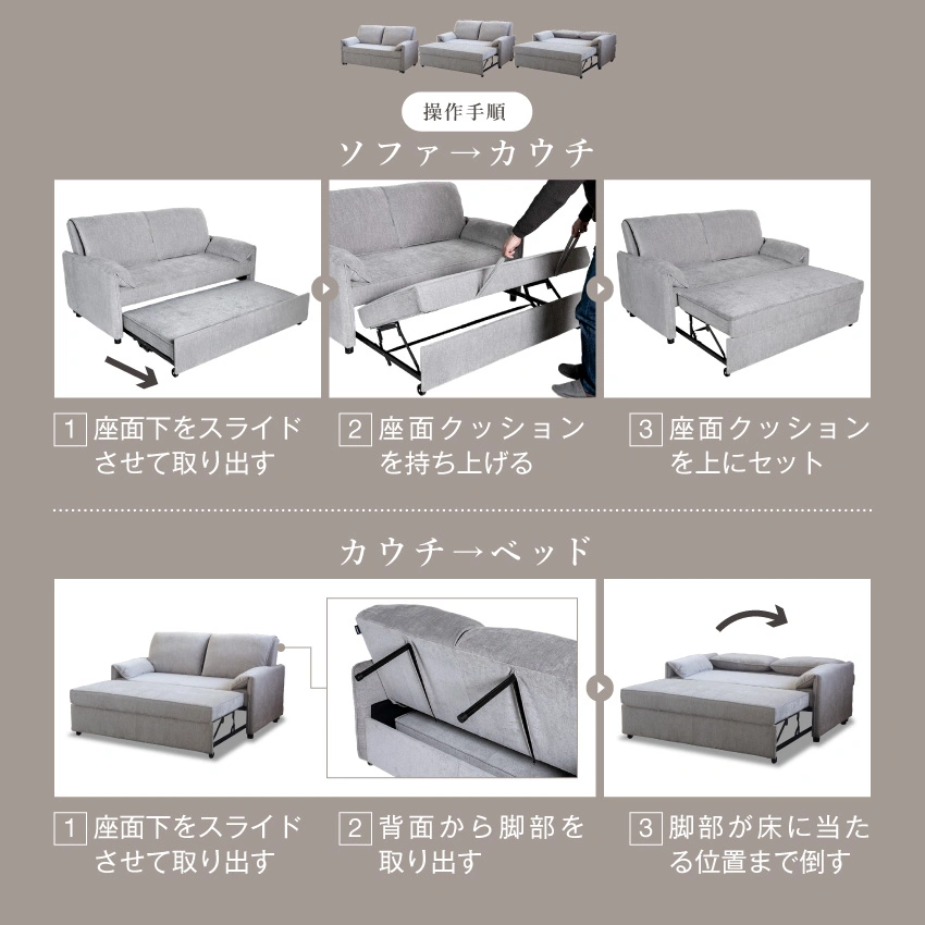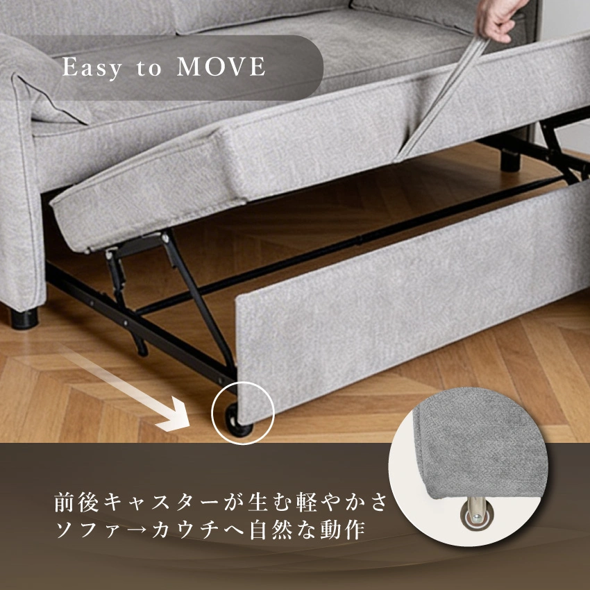 前に引き出すだけの簡単操作でソファ・カウチ・ベッドに変身する前方引き出し式3WAYソファベッド。