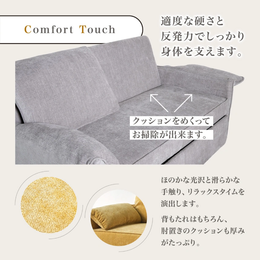 ひじ掛け部分と背もたれ部分を持ち上げてめくれるデザインのため、隙間に入り込んだホコリやゴミも簡単に取り除けます。忙しい毎日でも短時間でお手入れができ、清潔さを保ちやすいのがうれしいポイントです。