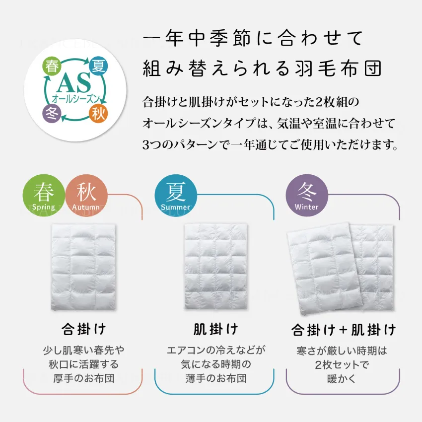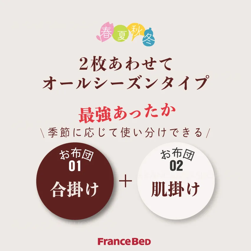 冬は合掛けと肌掛けを二枚重ねて使うことにより、しっかりあったかで寒さ知らず!春秋は、一枚外して合掛けのみ、肌掛けのみを使うことで季節ごとに柔軟な対応ができます。