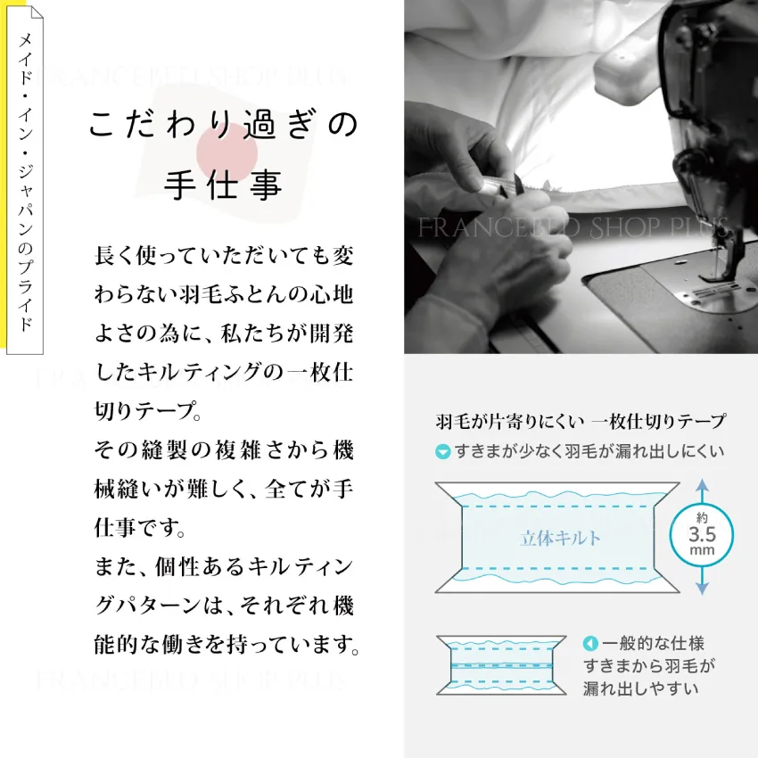 合掛けと互い違いのキルトにすることで保温力と寝心地を高めます。フランスベッドのJOORYU仕様の羽毛布団について