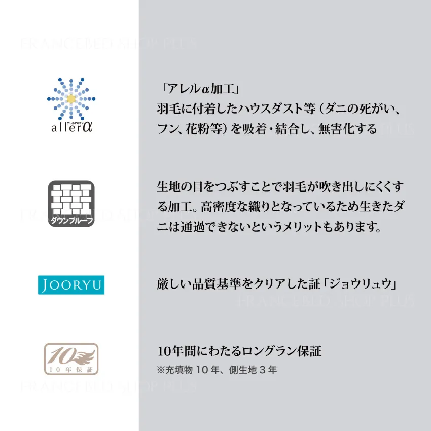 JOORYU=蒸留とは、厳選した水鳥の羽毛を輸入し、静岡羽毛工場で一貫生産。ダウン率90%以上、ダウンパワー350dp以上の羽毛にSEK制菌加工・アレルα加工、+5大悪臭消臭加工・防ダニ加工を施します。原毛・洗浄・選別・充填の4工程時における厳しい品質基準をクリアしたものだけがフランスベッドの羽毛布団に使用される特別な羽毛です。