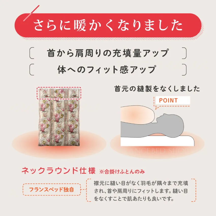 襟元はフランスベッド独自の「ネックラウンド」仕様で、襟元の縫製をなくすことで、首回りに羽毛があつまり、よりフィット感と温かさがアップしたキルトです。
