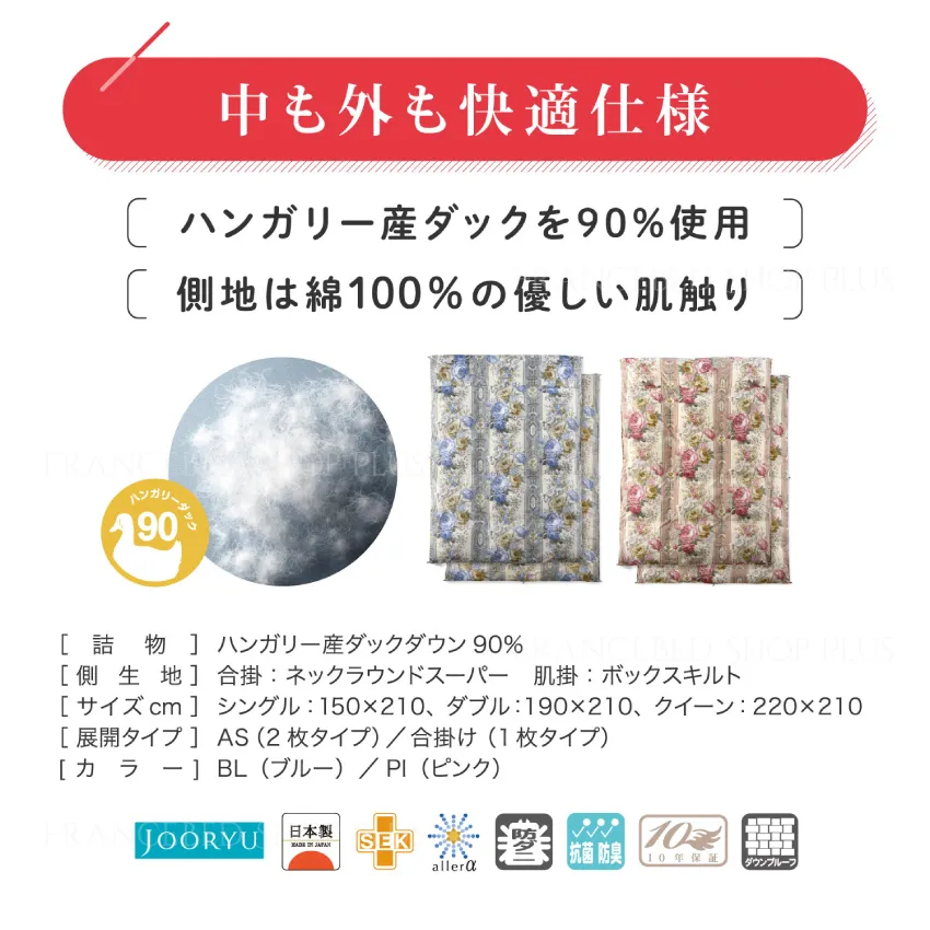 サイズ 幅150×長さ210cm 充填羽毛量 0.8kg+0.3kg 詰物 ハンガリー産ダックダウン90% 側地 綿100% 機能 - 詰物: