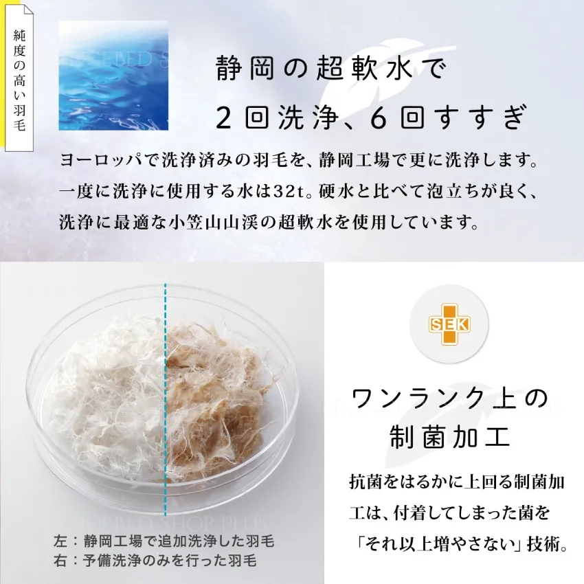 フランスベッド羽毛工場が建つ静岡県掛川市の小笠山を通してろ過された天然の伏流水を使用しています。安価な羽毛製品のなかには、洗浄工程の手数を省くことでコストを抑えていますが、目に見えないからこそこだわりたいポイントです。