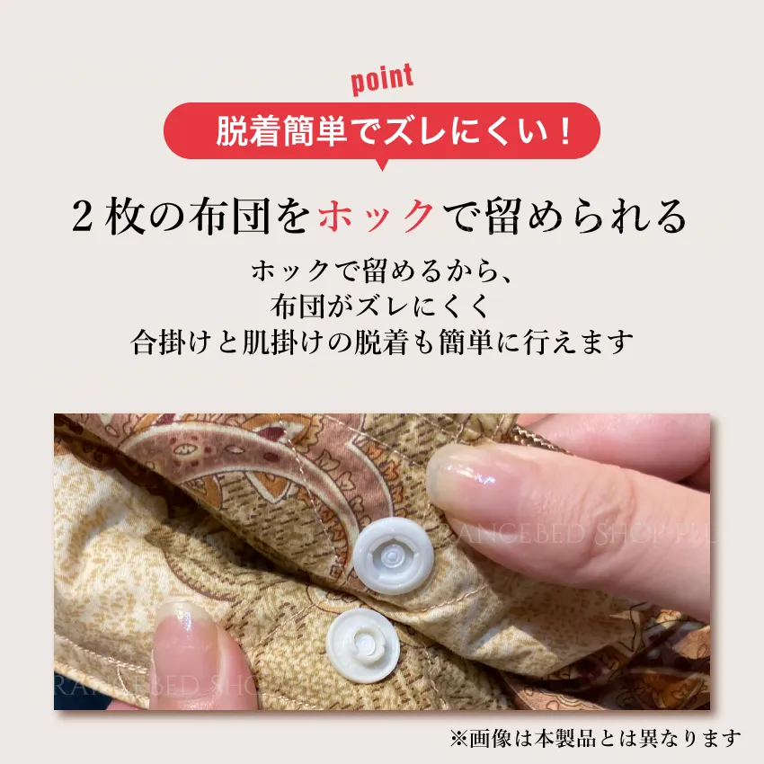フランスベッドの羽毛布団は、周囲8ヵ所にホックで留められるので、合掛けと肌掛け2枚のお布団がズレることなく朝まで眠ることができます。