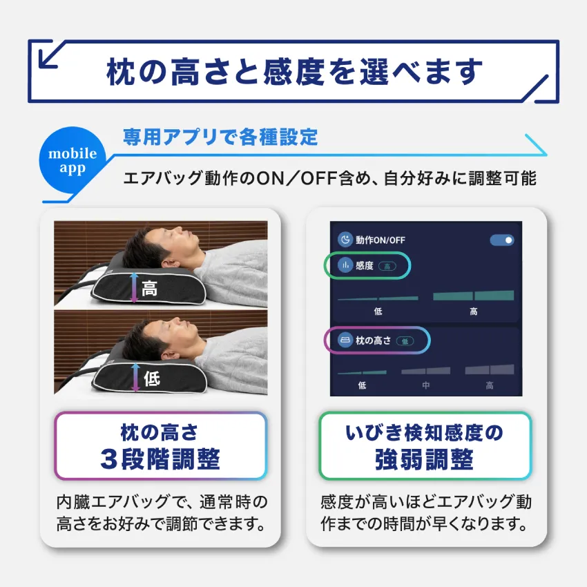 また、いびき検知の感度も専用アプリ内で強弱の設定調整が可能となり、感度を高くするほどエアバッグの動作までの時間を早くすることができます。