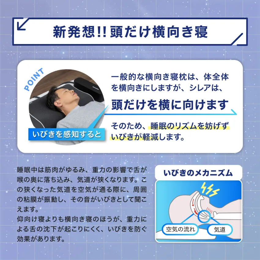 一般的な横向き寝は体全体を横向きにしますが、シレアはいびきを感知すると頭だけを横に向けます。