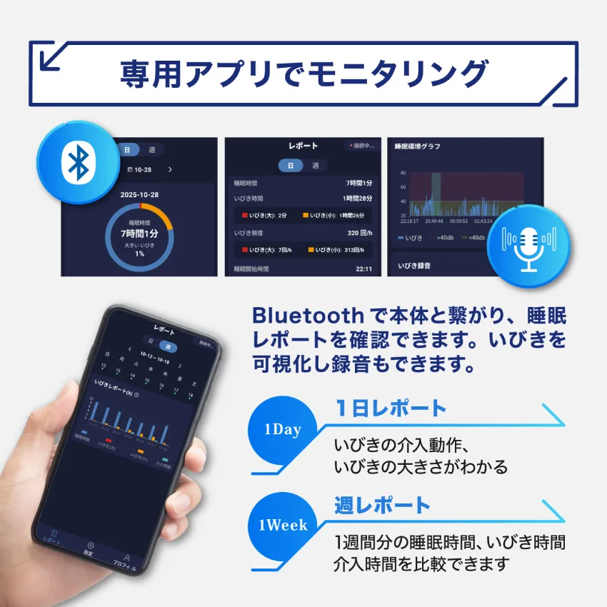 1日レポートでは、いびきの介入動作やいびきの大きさを確認。週レポートで1週間分の睡眠時間やいびき介入時間の比較ができ、ご自身のいびきの状態をグラフや時間でモニタリング。いびきの録音も可能です。