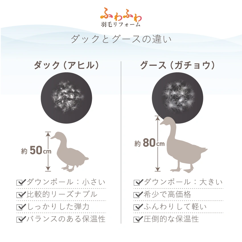 ダックとグースの違いは“羽毛の大きさ”と“保温力”にある