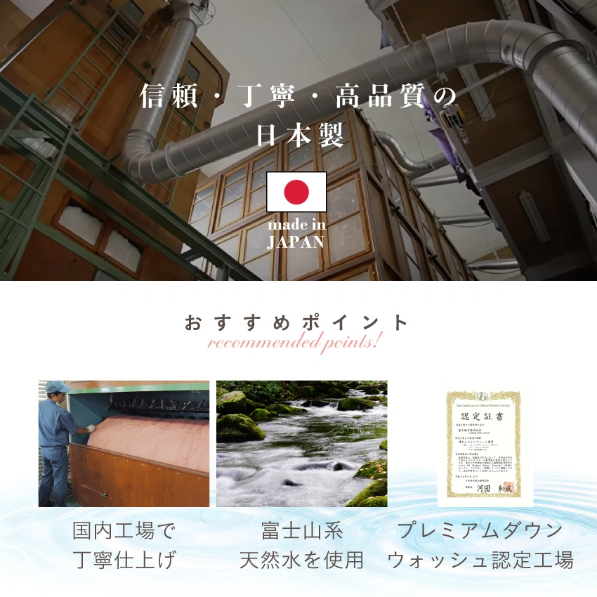 長年にわたり羽毛素材と向き合ってきた国内の寝具メーカーの弊社提携企業である富士新幸株式会社の国内工場において、羽毛の洗浄や選別、加工まで一貫して行い、品質を左右する「見えない工程」にこそ徹底したこだわりを持っています。確かな技術と丁寧なものづくりで、清潔でふっくらとした羽毛の魅力を最大限に引き出し、安心して使える寝具を届け続けています。一貫したラインでお預かりから完成まで一枚ずつ管理します。