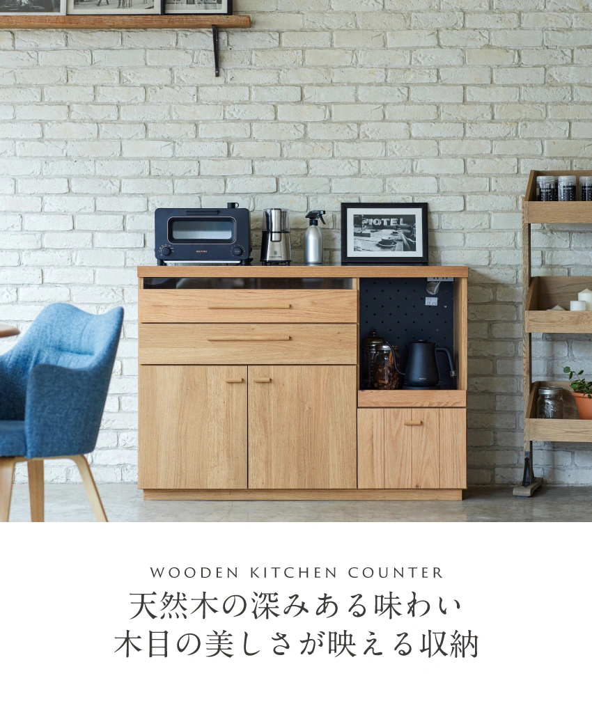あえて大きな節のある木目を生かした商品となっており、天然木の美しさが映えるシンプルなモダンナチュラルデザイン。前板に縦についたラインがおしゃれなアクセントになっています。引出しにはたくさんのカトラリーやランチョンマット、その他小物がたくさん入るスペースが確保されています。コンセントがついているのでトースター、レンジももちろん置けて便利です。いつもの食卓をおしゃれにおいしくいただけるキッチン収納です。