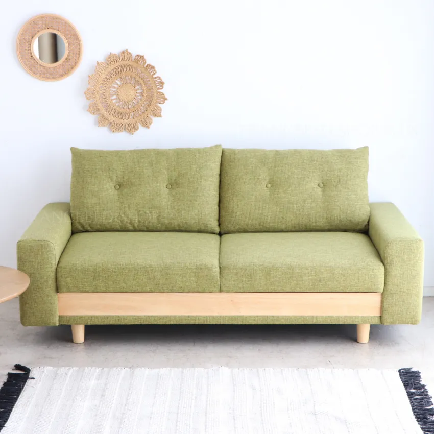 サイズ 幅165×奥行85×高さ74cm 座面までの高さ 36cm 耐荷重 150kg 張地 ファブリック 幕板 ラバーウッド無垢(ラッカー塗装) 脚 ラバーウッド無垢 座面中身 Sバネ+ワイヤ+ウレタン