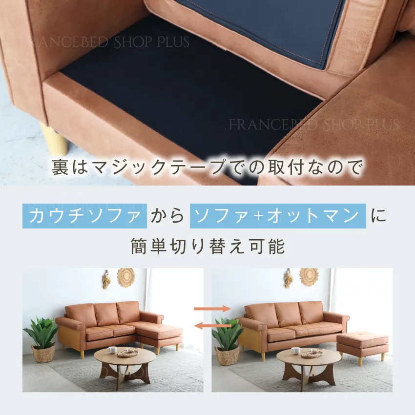 ソファの座面のクッションの裏側はマジックテープになっており、ソファから切り離して位置を変えることができます。ゆったりとくつろぎたい時はカウチソファに、 来客時にはソファ+オットマンに、分離してお使いいただけます。カウチの位置もお好きな場所に変更できます。